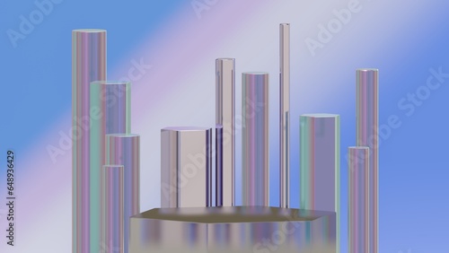 Creative background with hexagonal and cylindrical shapes, pearl and glassmorphism effect textures, violet - magenta - blue - very peri color gradient, 3D rendering