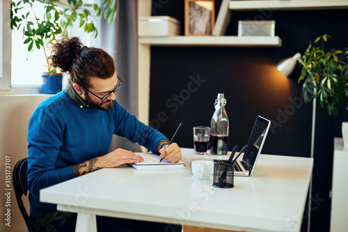 Creative caucasian bearded graphic designer sitting in his office and drawing in notebook.