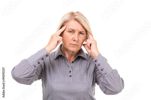 senior, adult, elderly, female, person, beautiful, beauty, caucasian, human, people, woman, 1, only, alone, single, studio, white, indoor, concept, idea, isolated, creativity, lifestyle, portrait, retirement, age, casual attire, leisure, blouse, old, lady, model, aged, modern, grey, blond, negative, sad, sorrowful, unhappy, serious, looking, standing, suffering, cephalalgia, disease, temple, migraine