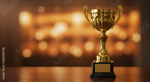 Creative concept showing a gleaming gold trophy on display, symbolizing achievement, excellence, success, victory, recognition, and outstanding performance in competitions, awards, or professional mil