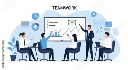 meeting, brainstorming, teamwork, presentation, strategy, colleague, planning, whiteboard, office, chart, business, conference, discussion, analysis, corporate, team, cooperation, employee, project, workplace, men at work, working, seminar, manager, coach, explain, desk, laptop, finance, career, design, progress, skill, vector, graphic, human, leadership, professional, training