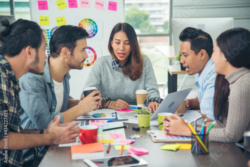 Creative design office center working teamwork. Happy business people partner plan strategy organization research people together at diversity office using laptop, smartphone company conference room