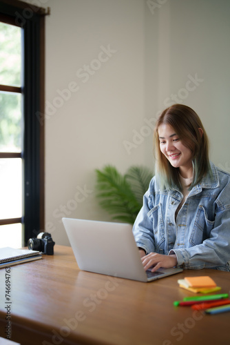 Creative designer woman using laptop to work about graphic design with new project in home studio