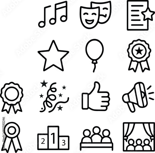 Creative icon set for entertainment and celebration with theater masks, stars, ribbons, podiums and more. Ideal for events and achievements.