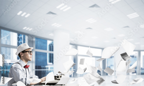 adult, attractive, author, bow tie, business, caucasian, concept, creative, creativity, desk, elegant, education, eyeglass, idea, inspiration, journalist, letter, literature, male, man, old-fashioned, retro, sitting, student, study, success, table, thinking, thoughtful, typewriter, vintage, write, writer, young, working, typing, 1, hat, city, office, building, inside, indoor, view, flying, paper, document