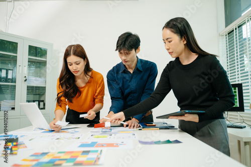 Creative team planning UI UX mobile app interface with wireframes and analytics, collaborating on digital product design, business strategy