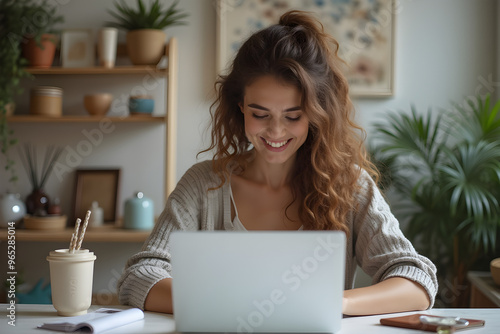 creativity, horizontal, laptop, occupation, photo, working, young adult, people, computer, technology, adult, missy, indoor, business, adults only, one person, color image, wireless technology, desk, entrepreneur, female, cyberspace, lifestyle, woman, small business, smiling, confidence, connection, owner, workshop, happiness, communication, home office, modern, design, fashion, professional occupation