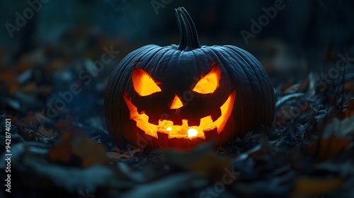 Creatively carved pumpkin glowing with an eerie face on a dark autumn night