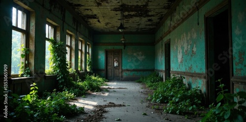 Creepy abandoned asylum with broken windows and overgrown vegetation, abandoned asylum, broken glass