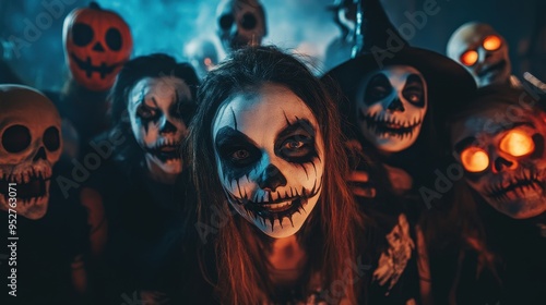 halloween, skittish, make-up, costume, group, people, party, game, entertainment, celebration, fun, eerie, holiday, festive, fantasy, horror, play, chilling, decoration, gathering, masquerade, performance, laughter, event, mask