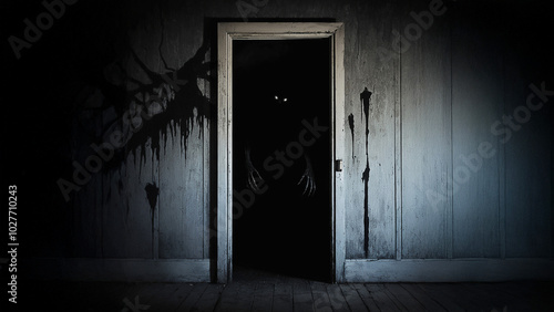 Creepy middleman silhouette background at the door of a dark abandoned house