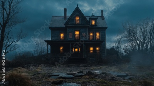 Creepy old house with glowing windows in a foggy, dark atmosphere.