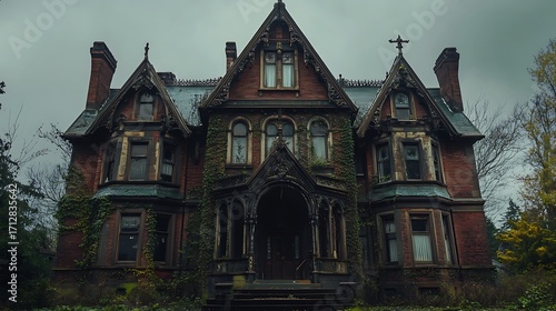 Creepy victorian mansion with gothic architecture and overgrown gardens