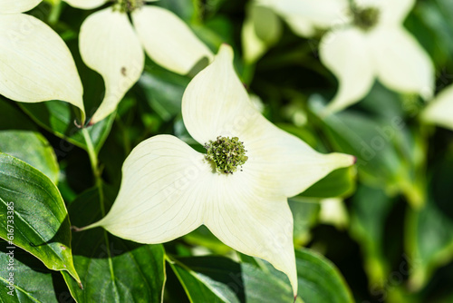 Cremefarbene Blütenlätter mit Blütenstand eines Asiatischen Blüten-Hartriegel Cornus kousa Strauch im Sonnenlicht