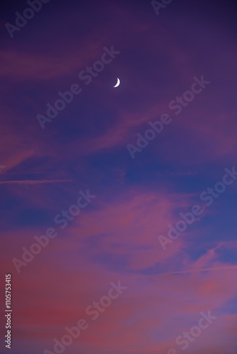 crescent, moon, sky, dusk, purple, pink, serene, dreamy, atmosphere, evening, twilight, nature, celestial, peaceful, cloud, sunset, horizon, tranquil, gloaming, scenic, beauty, landscape, outdoors, calm, aethereal, pastel, colours, gradient, astronomy