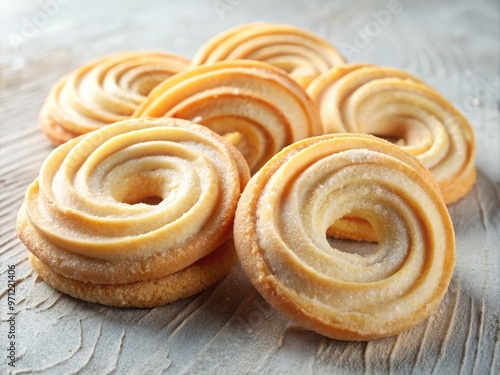 Crescent-shaped vanilla cookies, arranged in a loose spiral pattern, their tender curves and delicate tips creating a sense of whimsy and playfulness.