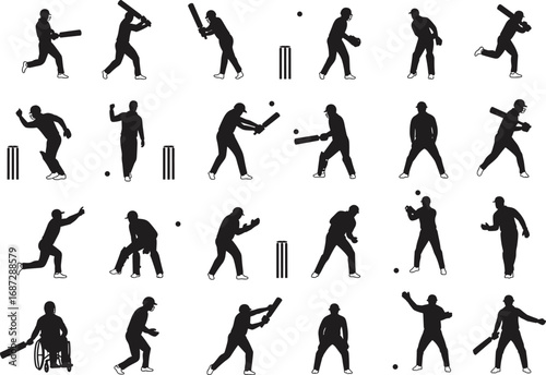 Cricket player silhouettes, batting bowling fielding, dynamic sports action, black vector athlete poses, outdoor game scene, competitive motion artwork, team sport illustration, icons set