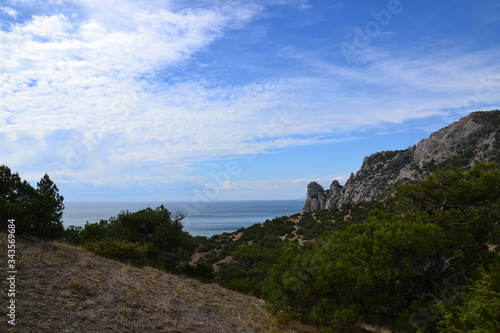 mountain, landscape, sky, nature, rock, sea, travel, cloud, blue, hill, green, view, mountain, forest, coast, water, cloud, tree, stone, rock, tour tourism, panorama, summer, ocean, island