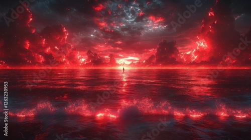 sunset, sea, red, ocean, fiery, cloud, crimson, sky, landscape, digital artwork, artwork, fantasy, surreal, dramatic, horizon, water, wave, glow, light, red sky, dark clouds, apocalyptic, inferno, hellish, intense, art, illustration, image