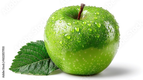 Crisp Green Apple with Water Droplets and Leaf on White Background for Food Photography and Graphic Design