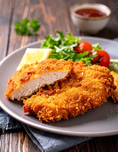 Crispy breaded chicken cutlet with a side salad and fries