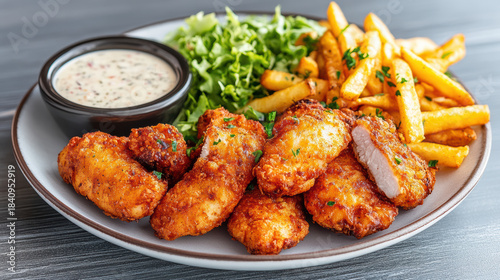 Crispy chicken nugget plate with fries and salad, creamy dip, appetizing golden crunch
