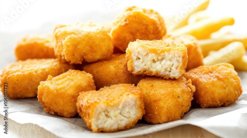 Crispy chicken nuggets and fries laid out on a paper liner, perfect for highlighting a casual and delicious fast-food meal
