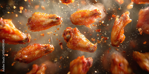 Crispy chicken wings flying through air, surrounded by spices and flavor. This dynamic image captures essence of deliciousness and excitement in food
