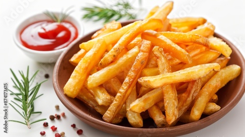 french, fries, potato, ketchup, food, snack, dinner, lunch, delicious, tasty, fast, cookery, culinary, eat, meal, plate, dish, side, comfort, greasy, crispy, gold, brown, red, white, ceramic, bowl, sauce, tomatoes, spice, pepper, rosemary, herb, fresh, closeup, macro, photo, still, life