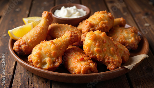 Crispy fried chicken drumsticks with cheese and lemon wedges on rustic wooden table
