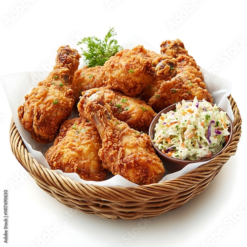 chicken, crispy, coleslaw, salad, basket, wicker, parsley, herb, food, meal, dinner, lunch, delicious, gold, crunchy, poultry, meat, side dish, picnic, take-out, homemade, cooked, fried, fresh, snack, fast food, cookery, white background, food photography, culinary, gastronomy, eat, woven basket