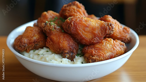 chicken, wing, fried, crispy, mashed, potato, bowl, food, dinner, lunch, meal, delicious, tasty, savoury, crunchy, gold, brown, meat, poultry, side, dish, eatery, comfort, classic, american, cookery, white, garnish, parsley, herb, creamy, texture, plate, serving, portion, greasy, hot, accessing, deliciously, unhealthy, junk food, carb, protein