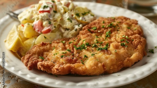 fried, chicken, potato, salad, food, meal, cookery, dinner, lunch, receipe, breaded, crispy, delicious, savoury, main, course, side, dish, tasty, appetising, culinary, epicure, homemade, eatery, dining, eating, photo, still, life, close, up, plate, fork, lemon, parsley, vegetable, tomatoes, white, yellow, warm, colours, styling, classic