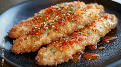fried, fish, strip, crispy, sauce, spicey, orange, red, ginger, garlic, sesame, shallot, delicious, dish, food, meal, eatery, plate, dark, black, closeup, tasty, appetising, healthy, protein, seafood, lunch, dinner, light, gold, brown, hot, flavorful, serving, photo, close, sea, cookery, savoury, easy