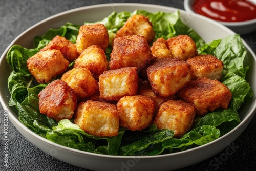 Crispy Fried Tofu Cubes Served on Fresh Green Lettuce