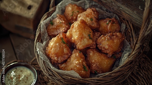 Crispy Golden Fried Pastries Served in a Rustic Woven Basket