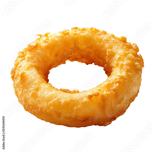 Crispy golden onion ring with a hollow center, showcasing a textured surface.
