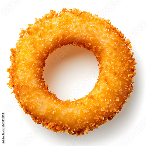 Crispy golden onion ring with a textured breading, isolated on a white background