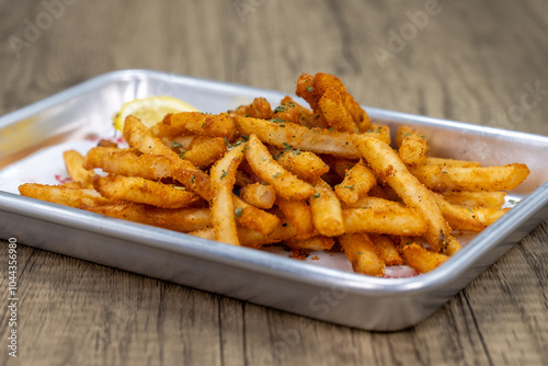 Crispy order of chili lime seasoned french fries on a tray