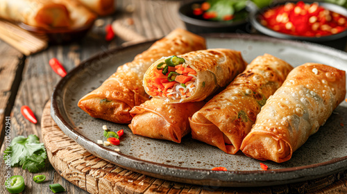 crispy spring rolls cut in half to reveal a vibrant and steamy filling, arranged on a glazed ceramic dish