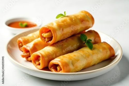 Crispy spring rolls on white background, served with sweet chili sauce , background, studio, snack