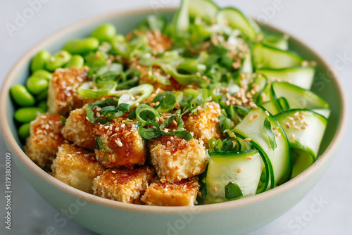 crispy, tofu, bowl, spring, food, sesame, cucumber, healthy, vegan