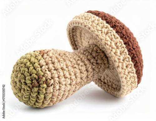 mushroom, crochet, toy, hand-made, craft, wool, knitted, decoration, cute, fungal, art, brown, white, isolated, nature, fiber, needlecraft, hobby, textile, soft, play, creative, object, design, element, single, symbol, style, background, nobody, indoor, studio, still, life, close, up, macro, detail, texture, ornament, gift, collectable, timberland, botanical, handcraft, dummy