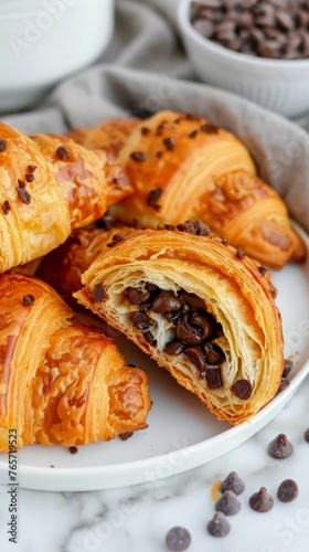 Crookie - croissant hybrid with chocolate chips. Golden croissants with a cup of coffee