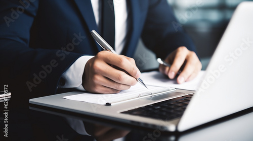 Crop close up midsection businessman use laptop, write email letter to business partner or client. Use computer mobile consult online on gadget, working from home, portable office. Ai generative.