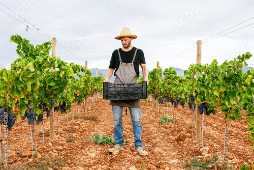 man, grape, harvest, adult, vinery, box, ripe, carry, farmer, agriculture, rural, male, fruit, shear, tool, vine-growing, natural, organic, sweet, bunch, food, countryside, autumn, guy, season, fall, fresh, vitamin, environment, industry, plantation, winery, juicy, container, outdoors, full body