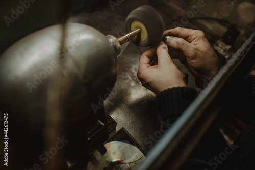 goldsmith, ring, hand, tool, workshop, metal, male, work, professional, craft, manufacturing, jewellery, jeweller, process, manual, equipment, job, workbench, hand-made, industry, detail, element, blank, man, adult, accessory, precious, hobby, occupation, tied-up, small business, grimy, production, indoor, crop, faceless, unrecognizable, anonymous, closeup, craftsman, artisan, artist, horizontal