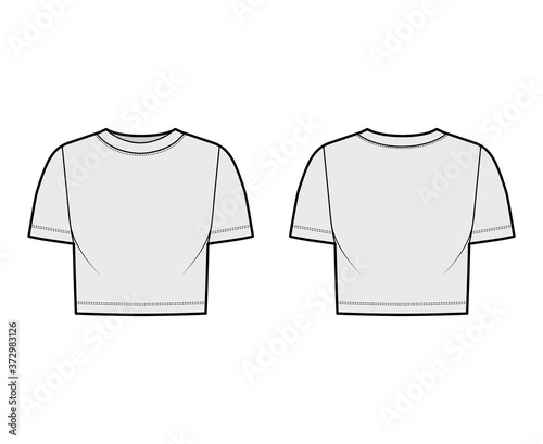 Cropped cotton-jersey t-shirt technical fashion illustration with scoop neck, short sleeves, relax fit. Flat outwear apparel template front, back, grey color. Women, men, unisex top CAD mockup.