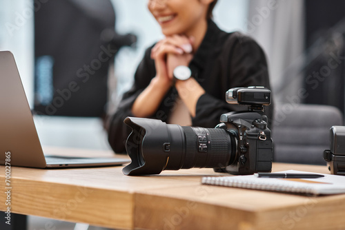 cropped focused view on camera on table next to cheerful blurred female photographer with wristwatch