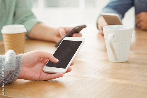young adult, man, male, caucasian, woman, female, interface, touch screen, touching, screen, technology, futuristic, cropped, hand, smartphone, table, wooden, brown, mobile phone, using, holding, cup, beverage, hot drink, freshness, refreshment, part of, business, workplace, drink, copy space, indoor